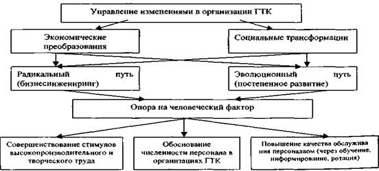 Таким образом, в настоящее время в России начинает складываться сеть организаций, предоставляющих туристские услуги, которые работают в условиях жесткой конкурентной борьбы за клиента. Особенно острыми проблемами у турфирм и гостиниц являются низкий профессионализм персонала и отсутствие законодательно проработанной государственной политики поддержки индустрии туризма. Выявленное в результате анализа разнообразие в целях и крупномасштабные изменения в организациях ГТК определяют современный подход к управлению ими. В основе эффективного управления организацией ГТК лежит управление изменениями, направленное на экономическое преобразование и социальные трансформации, в основе которых изменения в управлении человеческим фактором (рис.1).